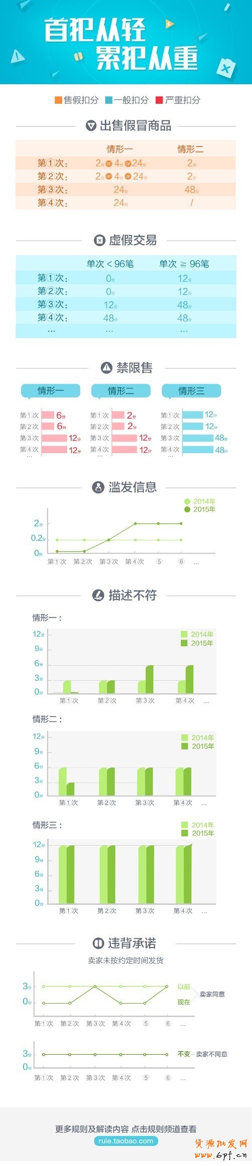 目前已經(jīng)有多個(gè)違規(guī)類(lèi)型是采用了“首犯從輕,累犯從重”的模式,對(duì)于初犯的行為,淘寶一般都會(huì)采取比較柔性的手段,但是對(duì)于一犯再犯的惡意行為,淘寶也不會(huì)姑息縱容,會(huì)采取比較強(qiáng)硬的手段來(lái)處理,下圖為截止目前所有的“首犯從輕,累犯從重”的情形,以及對(duì)應(yīng)的扣分邏輯匯總,大家需要注意了解的一點(diǎn)是,不同情形的扣分類(lèi)型不同,橙色分值為售假扣分,藍(lán)色分值為一般扣分,而紅色分值則為嚴(yán)重扣分。不管是哪種扣分,都希望大家盡量不要去違規(guī),畢竟,違規(guī)受到的任何處罰,對(duì)于店鋪的自身發(fā)展都是很有影響的。
