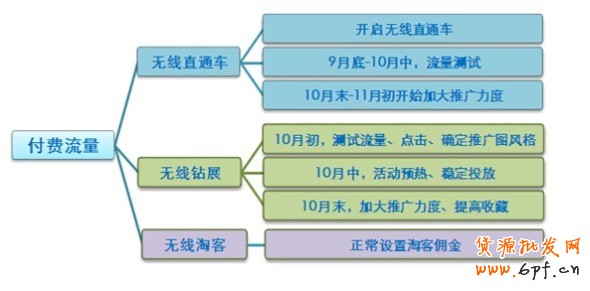 1.無線淘寶直通車的推廣是流量最大的引流方式和入口,針對無線淘寶直通車前期需要單獨建立計劃去推廣,第一步需要開啟無線淘寶直通車,單獨設立移動設備推廣計劃,通過精準關鍵詞和大詞的引流方式提高無線流量。之后9月到10月中旬,針對無線淘寶直通車的數據反饋和流量反饋做出調整。把PC端的展現量獲取能力引導至無線端方面,同時培養無線淘寶直通車的點擊率降低PPC。之后10月末以及進入11月針對無線端方面的引流可以增加花費預算,進一步提升無線端的投放推廣力度。