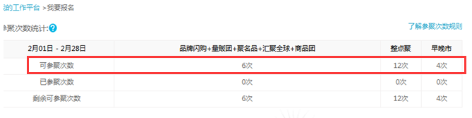 a、除了整點聚、無線早晚市、生活匯、航旅、儷人購以及特殊營銷活動之外,每個店鋪一個自然月中可參與聚劃算全網活動次數最多6次。
