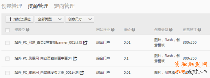 站外選擇全網300*250的一些展位,在創意的的選擇上面,添加了一些利用創意模板制作的動態圖,根據展位消耗和展位的投放數據來篩選優質的站外資源,因為站外的千次展現成本比較低,對于宣傳店鋪品牌是非常有利的。站外資源位主要投放一些綜合門戶類的網站,站外年前經過一次站外資源位底價的調整,很多站外資源位底價都降低到0.01元,我們選取了其中的兩個,通過使用底價0.01+溢價的方式來獲得精準的流量,提高流量的性價比。主要為以下3個: