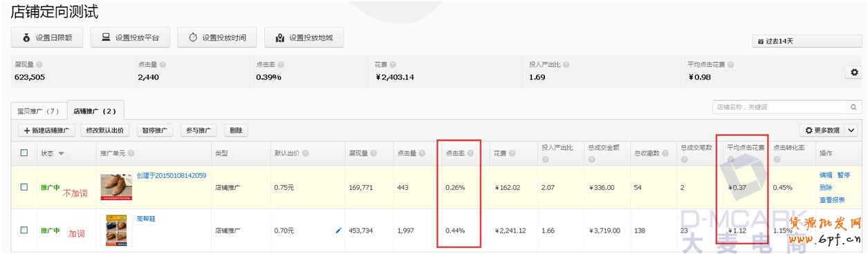 以上例子是一家男鞋店,加詞并且打開(kāi)定向的店鋪推廣計(jì)劃的點(diǎn)擊率遠(yuǎn)遠(yuǎn)比不加詞并且打開(kāi)定向的計(jì)劃要高很多,主要是關(guān)鍵詞的點(diǎn)擊率比較高,但是就轉(zhuǎn)化效果和PPC來(lái)說(shuō),不加詞的推廣計(jì)劃的轉(zhuǎn)化效果會(huì)更好,而且PPC更低。