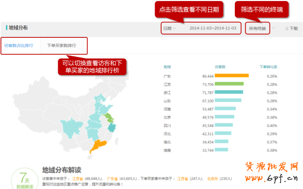 7天地域分布的解讀,幫助我們直觀地知曉店鋪來訪訪客的核心地域。