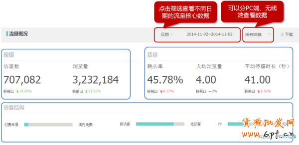 從流量總的規(guī)模知道店鋪的瀏覽量、訪客數多少及其變化;從跳失率、人均瀏覽量、人均停留時長,了解入店訪客的質量高低;從流量的付費免費結構、新老訪客結構、pc無線終端結構,知曉店鋪流量的整體布局。