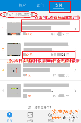 1、實(shí)時(shí)查看今日商品TOP50瀏覽榜,并提供今日實(shí)時(shí)累計(jì)支付金額和昨日全天累計(jì)支付金額;點(diǎn)擊單個(gè)商品可查看有關(guān)該商品效果詳情數(shù)據(jù);