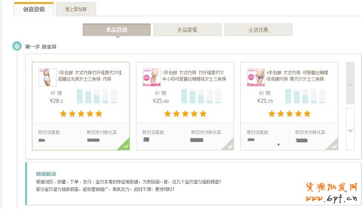 營銷推廣,我們可以看見寶貝的推薦指數,推薦指數越高的寶貝即更適合做營銷活動,可以根據店鋪活動需要做單品營銷、多品套餐搭配或者全店優惠活動。生意參謀幫你監測營銷效果。