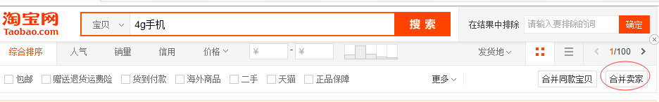 而且我們現在通過搜索入口右上角的“合并賣家”功能進去以后可以發現里面都是不顯示寶貝銷量的,合并前,是顯示銷量和付款人數。