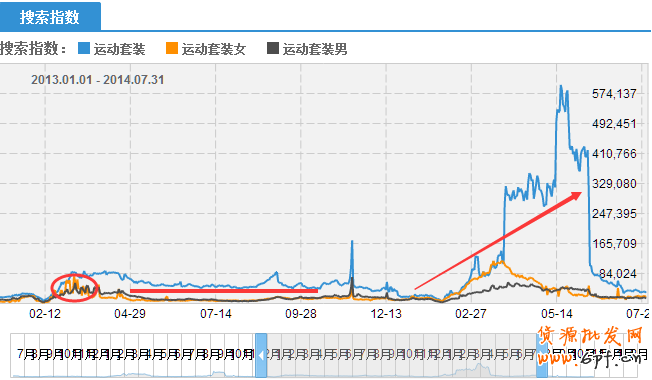 4.從2013年起相對比于2014年上半年,整個運動套裝搜索指數曲線市場有了大幅度的上升趨勢。同樣整個市場3月份的小高峰也清晰可見,可見運動套裝在3月后的整個市場前景是非常可觀的。