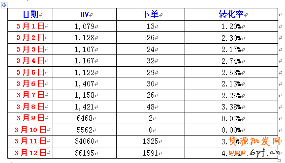 活動寶貝流量及銷量統計:可以看出活動當天單品UV達到3.4萬,和參加活動前的全店UV相比,增加了22倍!更值得關注的是活動后的7天正常UV和活動前的正常UV相比穩定到6000左右。增加了接近6倍!