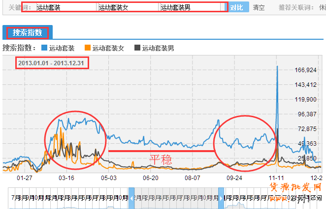 3.我們再從淘寶指數來了解2013全年的相關搜索數據,整個運動套裝市場的搜索指數在3月是一個全方位爆發的頂點(除淘寶大型活動),全年4~9月基本是平穩的市場。在雙11期間,整個市場的搜索的數據相當可觀,這說明淘寶雙11大型活動可以更好的吸引大量買家,更有力的促進了整個運動套裝市場,但是到1~2月期間,由于是春節的緣故,市場也有了波動。