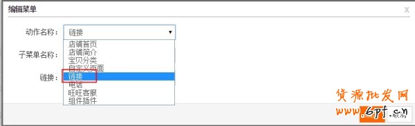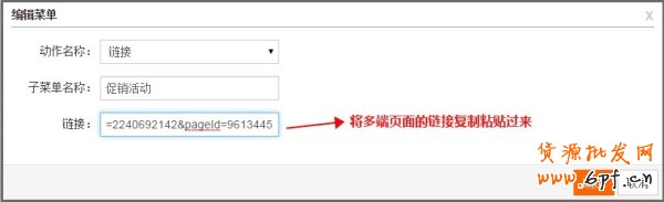 編輯菜單,動(dòng)作名稱選擇“鏈接”,子菜單名稱可任意填寫,如“促銷活動(dòng)”,鏈接需填寫多端頁(yè)面的無線端鏈接,可以從旺鋪后臺(tái)復(fù)制粘貼過來。