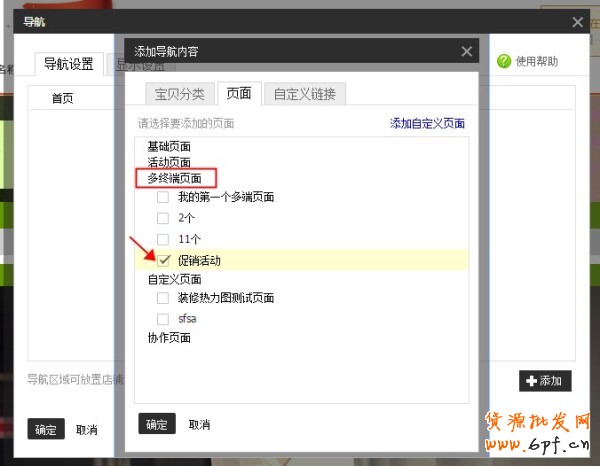 點(diǎn)擊彈框中的“添加”按鈕,找到“頁(yè)面—多端頁(yè)面—促銷活動(dòng)”并勾選,點(diǎn)確定保存