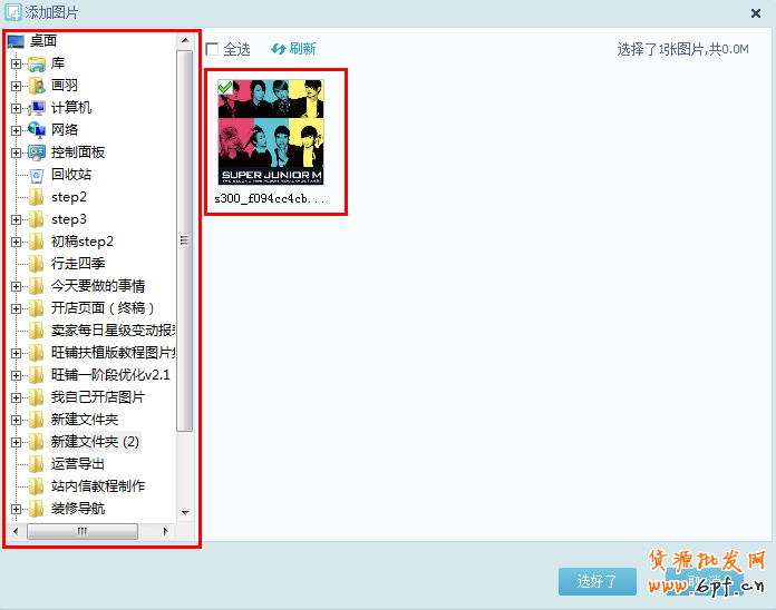 第三步:在跳出的選項框中選擇圖片,下圖左側(cè)方框為賣家自己電腦的圖片路徑地址,下圖右側(cè)方框顯示所在路徑的圖片,選擇好了之后,在圖片左上角勾選,再點擊“立即上傳”。
