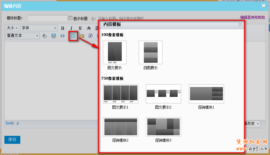 這里僅僅是自定義內(nèi)容區(qū)的編輯樣式,用戶可以直接使用預(yù)設(shè)好像素尺寸的圖片模版來進行商品圖片編輯和促銷模塊編輯。根據(jù)預(yù)先標記了的長寬尺寸,進行圖片制作,再將制作好的圖片插入到具體對應(yīng)的區(qū)域,即可完成單個商品或者整個促銷區(qū)的編輯操作。