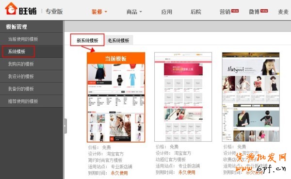 進入裝修后臺,點擊“裝修”-“模板管理”-“當前使用的模板”,如果您看到的設計師是淘寶官方,那么您使用的就是旺鋪系統模板,此時點擊左側菜單的“系統模板”,找到當前模板,便可以看出自己用的是新系統模板還是老系統模板了。