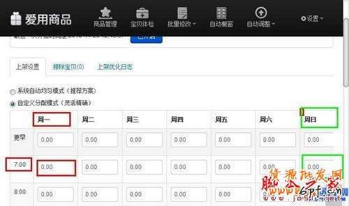 我們選擇自定義分配模式,我們用紅色方框表示出周一7點(diǎn)的比重為0,也就是沒有任何商品在這個時間點(diǎn)上架,這樣做是因為這個時間點(diǎn)沒有人買東西。然后在周日的七點(diǎn)也設(shè)置權(quán)重為0