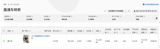 經過一段時間的測試,把賬戶內測試得不好的寶貝暫停了,而效果比較好的寶貝加大推廣力度。其中一款中長款的襯衫效果比較好,寶貝的流量水平比較穩定,點擊與轉化的效果都比較好。所以我們就以這款寶貝作為重點款進行推廣,不斷提高寶貝的流量精準性,提高寶貝的轉化效果。