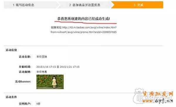 設置好后點完成,就設置好了,到下面的界面。可以對這個活動進行下宣傳推廣,加大活動的效果。