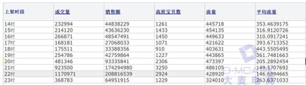 可以看到18點的總流量雖然是高峰期中最少的,但平均流量是比較高的,所以如果寶貝的銷量不高,建議選取競爭環境相對沒有那么激烈的時間段,如17、18、19點都是比較好的選擇。
