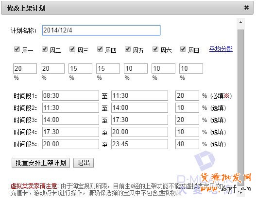 一些男裝、女裝店鋪的寶貝數非常多,有的店鋪幾百個寶貝,每一個都手工去選擇優質的上下架時間太耗時間,也沒有必要。那么對于高寶貝數的店鋪,我們可以用批量操作和精細化操作相結合。例如使用生e經設置上下架時間(并不是專業設置上下架的軟件),我們可以根據流量高峰時段的分析分配寶貝數量,例如下圖: