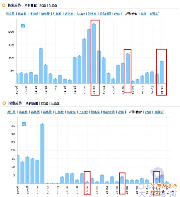 從條形圖中可以看到:男裝T恤類目的PC端訪客高峰期是10:00-23:00,其中最低峰是18:00-19:00,無線端的高峰期也差不多,但是規律不一樣,晚上20:00-23:00這段時間的流量特別大,那么我們可以分別針對PC端和無線端去設置,比如一些主打PC端的寶貝設置成晚上22:00下架,而主打無線端的寶貝設置成23:00下架。如果寶貝的銷量比較高,可以挑選最大的流量高峰,如PC端的15:00-17:00,晚上20:00-23:00。