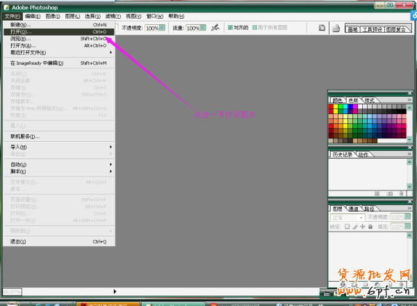 2.在ps中左上角“文件”欄目下找到“打開”。(如下圖)