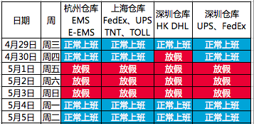 2.受香港DHL假期影響,深圳倉庫HK DHL渠道放假時間為4月30號-5月3號。4月29號為節(jié)前最后一天安排出庫,如果遇到港車查驗,將有可能會延遲到5月4號過港交貨。