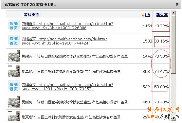 筆者在選擇落地頁初始,像大部分操作人員一樣,選擇的單品的寶貝,但是如上圖所示,數據反饋單品的跳失率基本都在60%以上,因此重新對單個產品和整個店鋪進行分析,考慮到店鋪內前幾個寶貝銷量差別不大,并且沙發(fā)墊的風格多樣,因此很難確定某一款就一定受消費者喜歡,因此調換首頁為落地頁,并且保證創(chuàng)意圖片上的寶貝全都能夠集中在首頁的前三屏內,這樣既給消費者提供了更多的選擇,同時還提高了訪問深度,降低了跳失率,自然而然的也就提高了鉆展轉化。