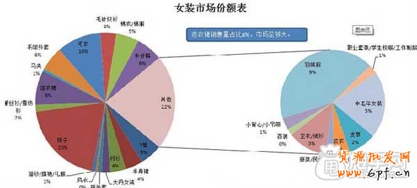 褲子20%、毛衣10%、羽絨服9%、連衣裙8%,毛呢外套6%,T恤5%,中老年服裝5%,牛仔褲6%,等等。
