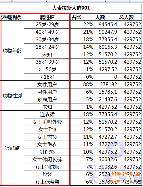 首先,我們從品牌特征,主推商品,競品店鋪,客戶行為等多個維度分析店鋪的基本信息。我的店鋪是做女裝服飾的,主推服飾的風格是輕度民族風。明白了這些,我們客戶人群的年齡段、職業屬性、興趣點是不是就清楚了。如下圖,我們可以將所確定的客戶屬性列出,方便下一步進行全網數據的統計篩選。