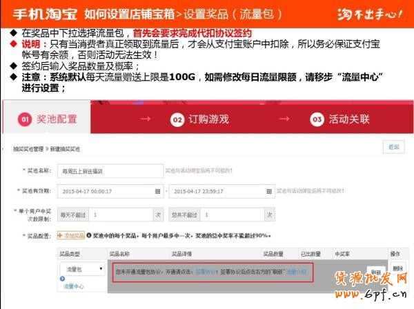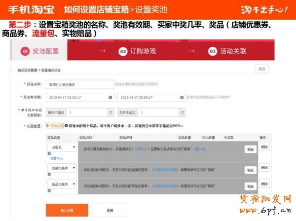 設置獎池步驟:先設置獎池名稱,獎池名稱主要是方便與寶箱活動綁定,獎池有效期(注意,獎池有效期應大于寶箱活動時間,否則設置不成功,且獎池與活動綁定后,時間不能修改)、單個買家的中獎頻率和次數,選擇獎品,獎池中的獎品可以選擇手機流量包(點擊查看介紹教程),店鋪優惠券,商品優惠券及實物贈品。