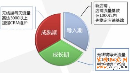 首先無線端的周期判斷也是非常的簡單。如果你的店鋪流量基數在1000以內,那么店鋪就處于導入期,這個時期應該先穩定店鋪基礎。如果你的無線端流量每天可以達到1000~3000,就是出于成長期的店鋪,這個時期我們要加強推廣力度。如果你的店鋪無線端每天流量高達3000以上,那么恭喜你,店鋪已經步入了成熟期,這個時期就要加強CRM的維護。