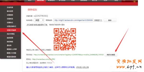 2.設(shè)置好后,接下來我們把抽獎(jiǎng)放入手機(jī)店鋪,系統(tǒng)生成的手機(jī)鏈接不能直接放到手機(jī)店鋪,但可以發(fā)布到微淘廣播,我們可以把手機(jī)抽獎(jiǎng)地址發(fā)布到微淘,把微淘的地址放到手機(jī)店鋪里面。