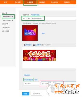 3.進(jìn)入wuxian.taobao.com,選擇廣播管理設(shè)置內(nèi)容,點(diǎn)擊添加頁面鏈接,把上圖的其中一個(gè)抽獎(jiǎng)鏈接放到這里,任意一個(gè)都可,點(diǎn)擊發(fā)布,如下圖,這樣我們就得到了微淘的抽獎(jiǎng)地址。