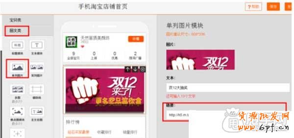 進(jìn)入手機(jī)店鋪首頁(這里建議選擇單列圖片模塊),鏈接放上面的微淘鏈接。