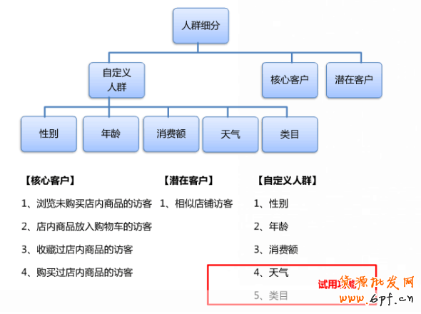 從以上的圖表中不難看出,核心客戶、潛在客戶、自定義人群是并列關(guān)系,自定義人群性別、年齡、月消費額以及天氣和垂直類目是組合關(guān)系