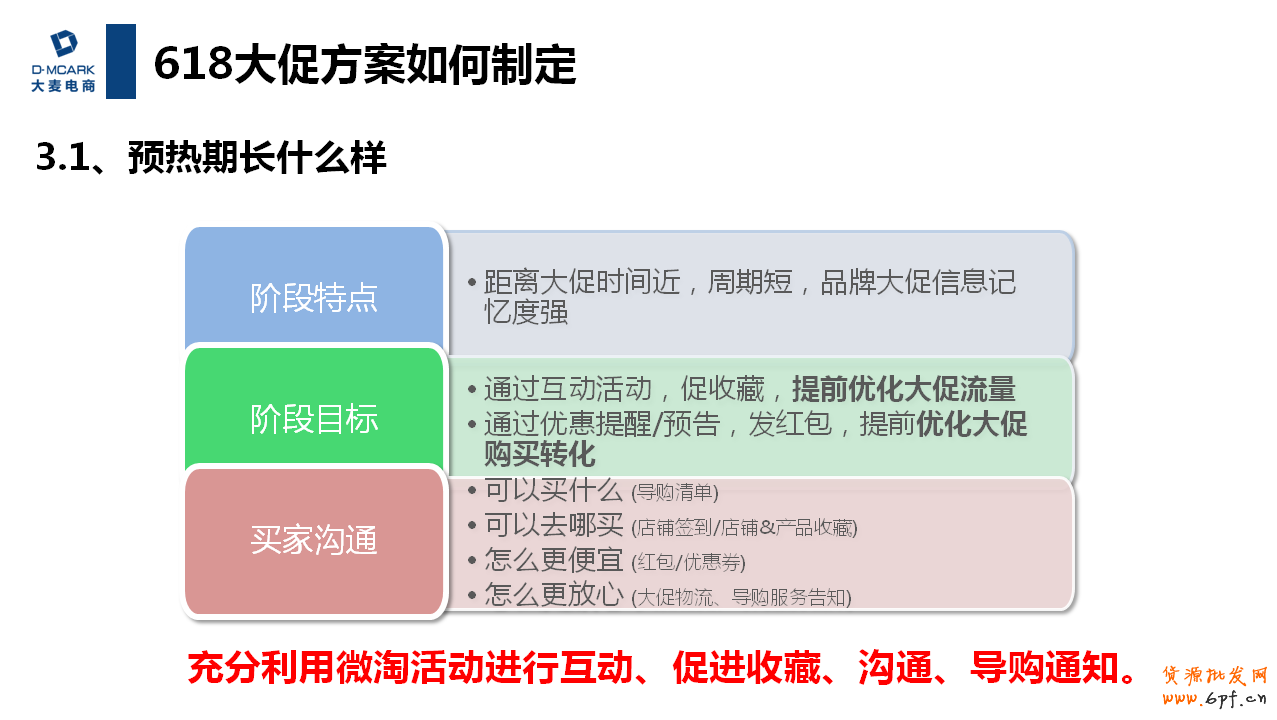 預熱期具有哪些特點呢?距離大促時間近,周期短,品牌大促信息記憶度強;以及這個時期商家們的階段目標和買家進行互動的時候需要從哪些維度出發,都具備它的特性。作為商家,這個時候我們需要通過互動活動,促收藏,提前優化大促流量,通過優惠券提醒或預告,發紅包,提前優化大促購買轉化。同時我們要研究買家心理,這個時候買家一般在思考可以買什么、可以去哪買、怎么更便宜、怎么更放心等。那么我們就要圍繞買家想的,具體落實頁面設計和活動布局,例如做導購清單、店鋪簽到、產品收藏、紅包優惠券、大促物流告知等。對于這些細則點,有很多是能夠在無線端實現的。尤其是通過微淘去實現。我們可以他充分利用微淘活動去進行互動、促進收藏、和消費者進行溝通,還有放上我們的導購通知等等。