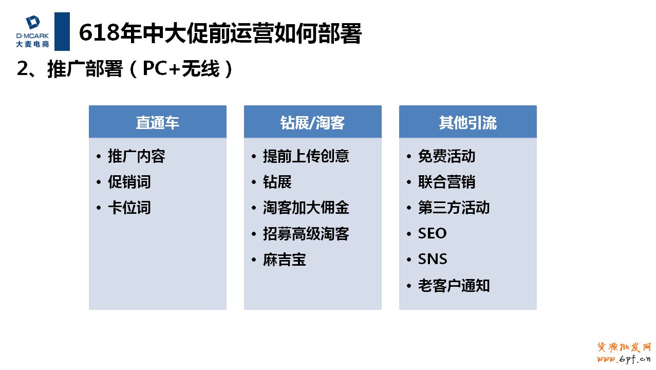 結合前面的各個時期的營銷玩法,落實到各個崗位分工,包括的維度有:具體時間節點、具體的人員需要執行的具體內容。例如美工要做預熱頁面、大促首頁、大促后首頁、寶貝詳情頁優化、大促各種試試海報、大促售罄圖、大促推廣圖、大促秒殺等; 客服方面就要做好主動提醒收藏、提前設置快捷術語、設置旺旺簽名、自動回復短語、補差價安撫術語等等; 倉儲方面需要核實安全庫存、配備打包人員、提前質檢、50%的主副推款提前打包、多次短信通知老客戶等;