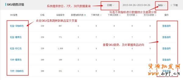 SKU銷售詳情查詢,提供了SKU信息(顏色、功能)、價格、當(dāng)前庫存、新增加購件數(shù)、下單件數(shù)、下單買家數(shù)、支付件數(shù)、支付買家數(shù)的數(shù)據(jù)統(tǒng)計展示。同時,也提供SKU的銷售趨勢分析。