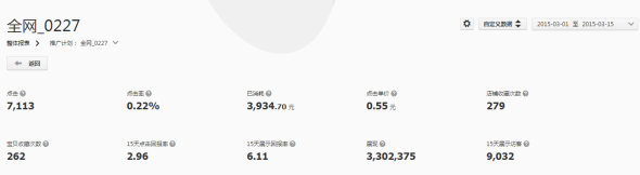 年終:春節期間考慮到店鋪流量下滑嚴重和春款上新之后的推廣,所以鉆展是持續投放的,小預算主要以引流為目的,但是在投放過程中發現數據也是非常不錯的,整體PPC在0.1左右,回報率在2.6左右。年前預算相對較小,初四開始逐漸加大預算,為2月26日的上新做準備。