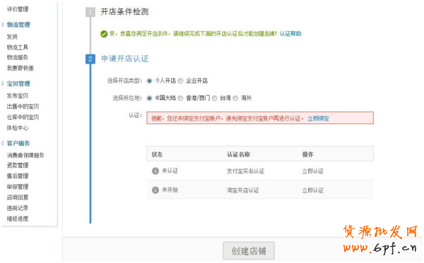 3、當所有開店條件檢測都通過了后,則需要完成支付寶賬號綁定,并且申請支付寶實名認證和開店認證。當所有認證都通過了后,才可以點擊創建店鋪。