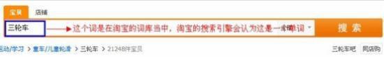 因為這個詞在淘寶的詞庫當中,搜索引擎會認為“三輪車”是一個單詞,展示的時候只會展示“三輪車”這三個字連在一起的情況: