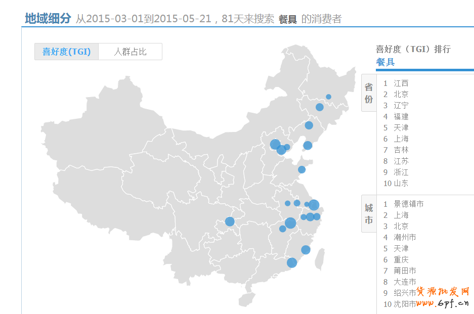 看購買地域,我們店鋪在唐山,所以唐山附近的城市例如北京、天津、大連、沈陽這些地的購買用戶就特別多。然后有同行是景德鎮(zhèn)的,購買群體就會集中在江蘇,紹興,無錫這些地。