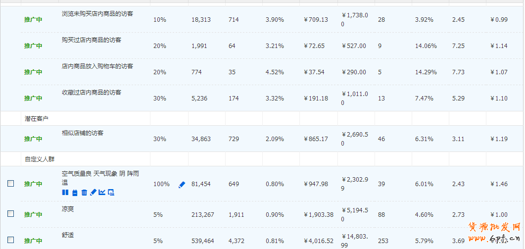 搜索人群這塊,前期主要以測試這幾大部分為主,前期的比例不需要太高,后期根據數據再進行調整,效果好的話可以繼續加大,或者在沒有流量的情況也可以加大測試,如下圖在沒有流量的情況下就可以繼續加大測試。