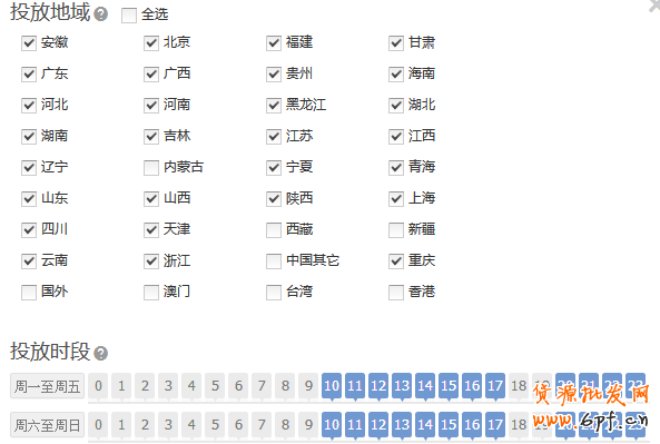 通過生意參謀綜合最近30天的訪客時間端分布設定投放時間段,為早晨10點都下午17點,晚上19點到22點,無線端的話可以延長一個小時,投放地域方面沒有做很精準的劃分,國外港澳臺和偏遠地區不投放,因為預算較大,又沒有選擇流量較大的位置,如果投放地域范圍小的話,會買不到流量。