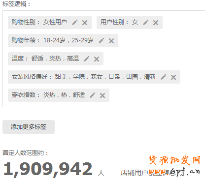這里篩選了6個標簽,主要以一些基礎信息結合天氣以及女裝風格偏好來圈定的人群,現在是初夏,馬上進入夏季,店鋪內的寶貝也都是夏款了,天氣方面選擇炎熱,高溫,店鋪是日系小清新的風格,年齡偏向18~29歲,女裝風格偏好選擇了甜美、森女、日系、清新等符合店鋪整體風格的,整體圈定人群數在200W左右。