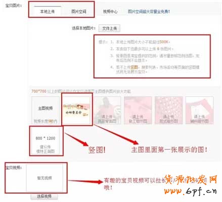 打開寶貝的詳情頁編輯頁面,我們可以從本地上傳圖片或圖片空間。圖片的數量最多是5張主圖展現和1張豎圖。