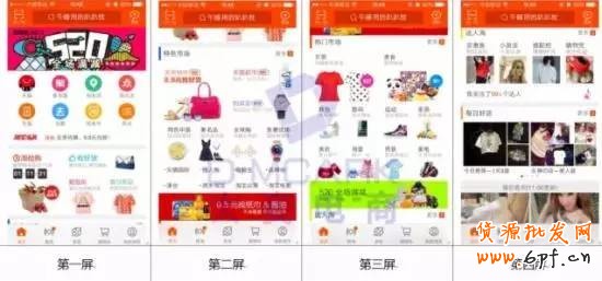 從手機淘寶的前四屏中,我們可以看到手機淘寶基本可以分為5個大版塊: