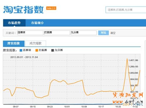 比如說,銷售的是連褲襪,那么關鍵詞可以是連褲襪、打底褲、九分褲等。然后我們把這三個詞都輸出淘寶指數搜索框,對比如