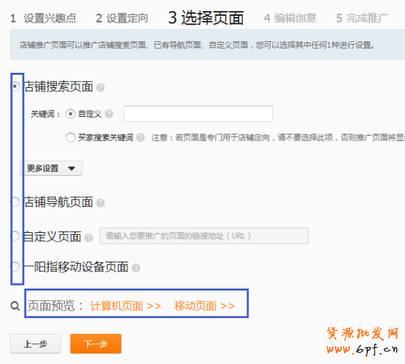 這里是選擇落地頁,就是客戶點擊完成之后進(jìn)入到的頁面,因此要選擇與之前所填屬性相吻合的頁面,可以自定義也可以是店鋪導(dǎo)航頁面。至于投放平臺,我們最好是計算機和無線都進(jìn)行投放。