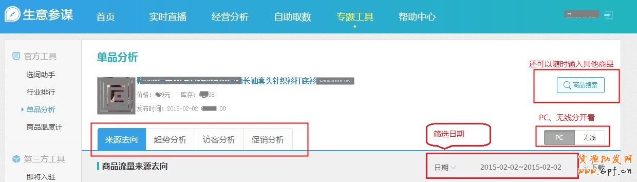 進入生意參謀平臺,查看 專題工具—>單品分析 or經營分析—>商品分析—>商品效果—>單品分析
